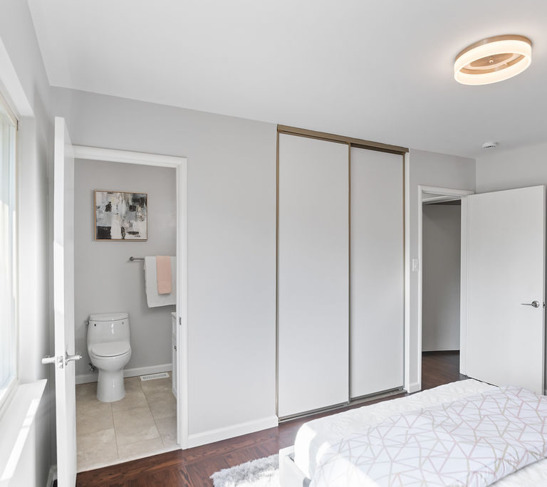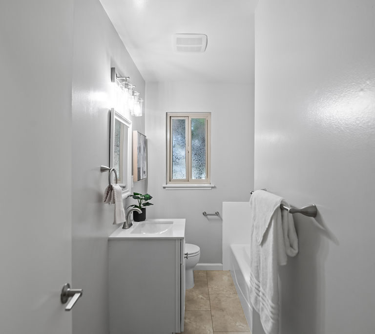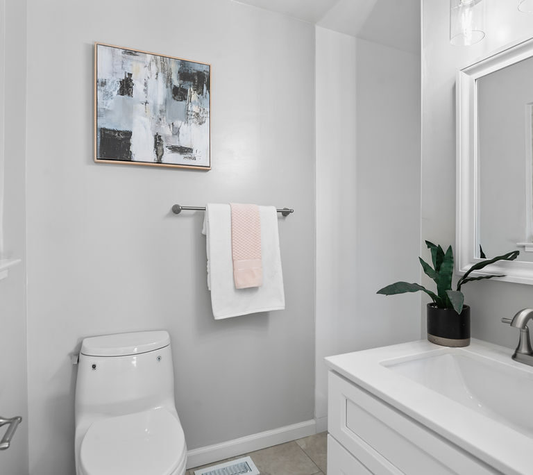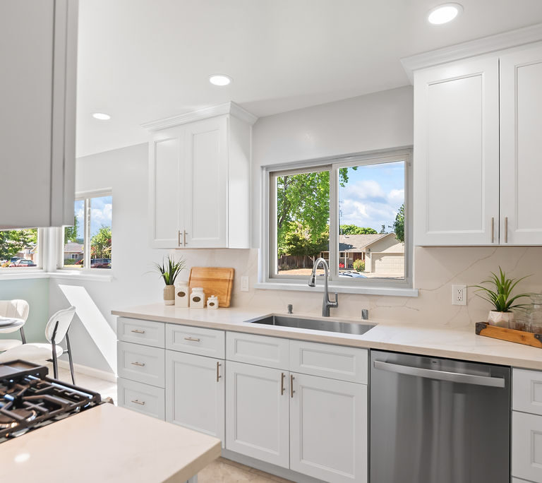The kitchen is a true standout with all-new stainless steel appliances, white Shaker-style cabinets, quartz counters with matching backsplash, and breakfast nook.